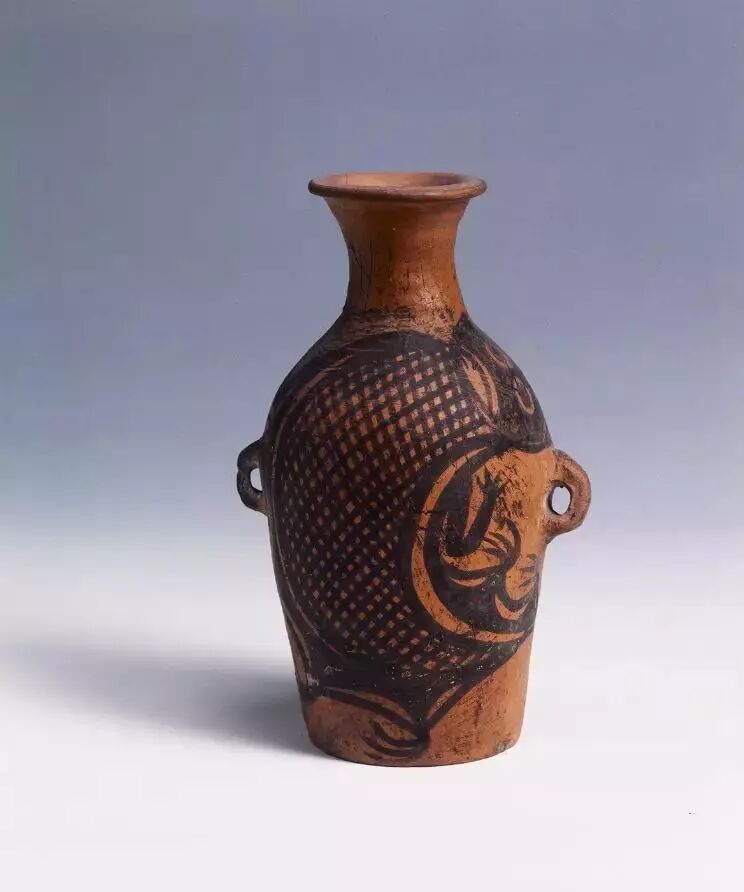 鯢魚紋彩陶瓶,仰韶文化石嶺下類型,出土于武山縣馬力鎮(zhèn)傅家門村種谷臺遺址。國家一級甲等文物,通高18.7厘米。細泥紅陶,侈口、圓唇、束頸、溜肩、深斜腹、平底,兩側(cè)肩下各有一耳。紅陶黑彩,繪有一條胖大黑色鯢魚,鯢魚紋臉部為人面,有四足,足端各有四爪,尾部上翹,身上繪有網(wǎng)格狀鱗片,紋飾線條流利而靈動,變化豐富。這件彩陶瓶具有非常高的歷史和文化價值,其圖案具有原始龍的雛形,被學(xué)界認為是中華龍的起源之一。