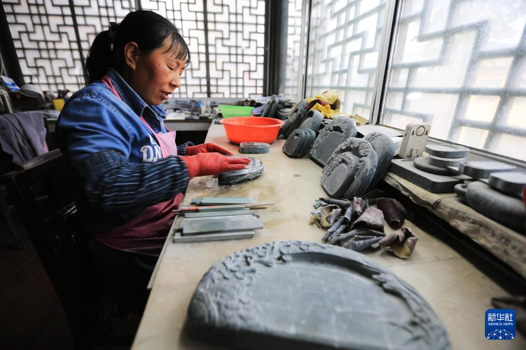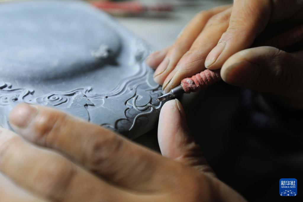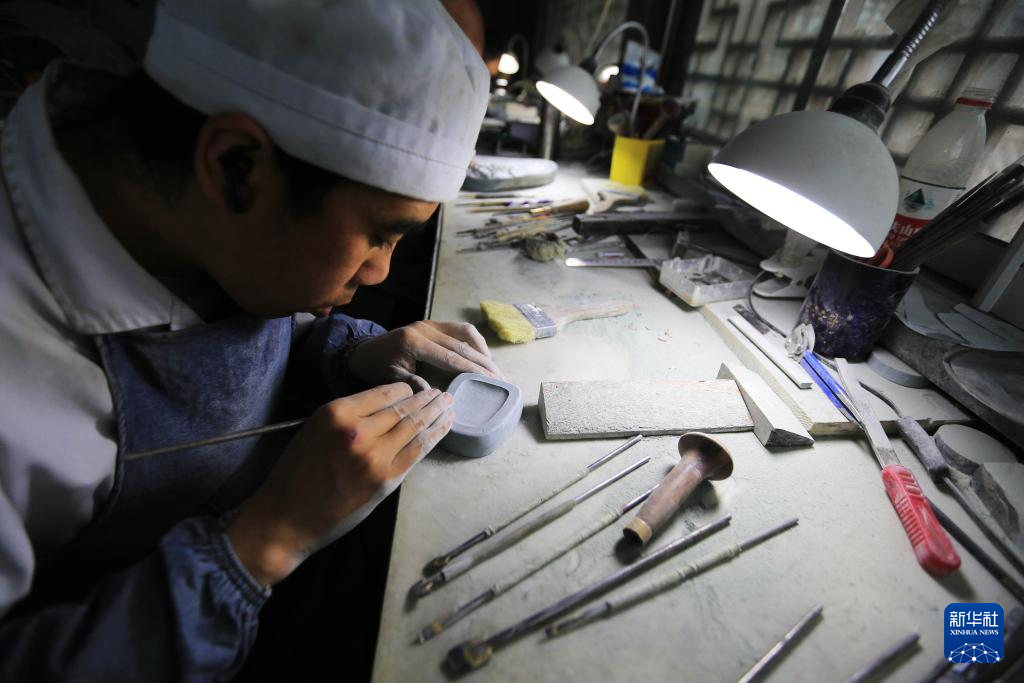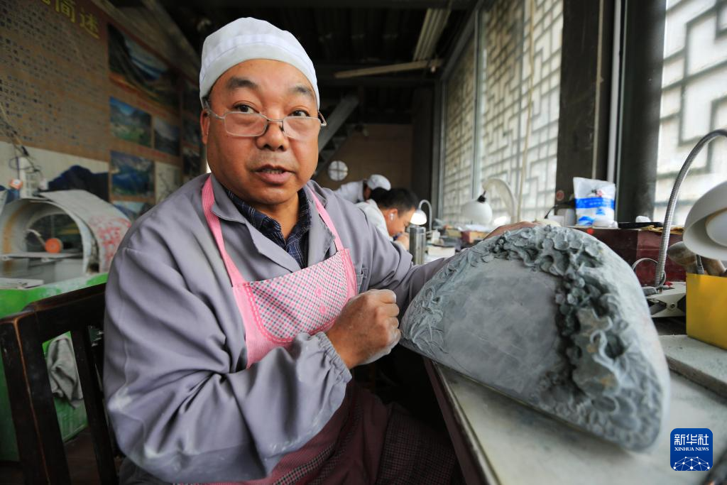 10月24日,藝人在甘肅省定西市臨洮縣洮硯藝術館雕刻制作洮硯。新華社發(fā)(王克賢 攝)
