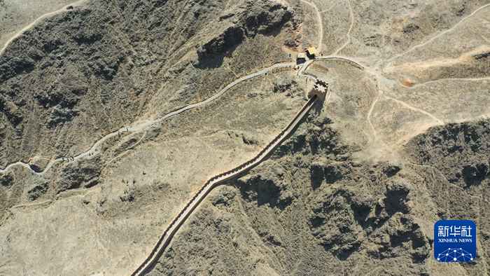 這是5月17日在甘肅省嘉峪關(guān)市拍攝的懸壁長城(無人機(jī)照片)。新華社記者 陳斌 攝