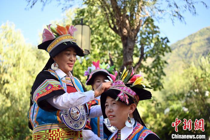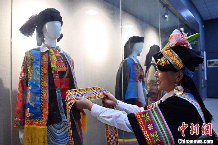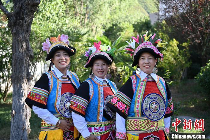 9月26日,甘肅省甘南藏族自治州舟曲縣,當(dāng)?shù)夭刈鍕D女展示錦帶佩戴方式。錦帶是舟曲藏族婦女用以束腰、扎靴、攏發(fā)乃至點(diǎn)綴服飾的花帶子,艷麗多彩、圖案優(yōu)美。每逢吉慶節(jié)日,藏族婦女穿戴的華麗盛裝就需要少則五、六條,多則十幾條寬窄長(zhǎng)短相宜的錦帶來裝飾。據(jù)介紹,藏族織錦帶技藝歷史悠久,一千多年以前,古羌族和吐蕃已有了較發(fā)達(dá)的手工編織技術(shù),在艱難的生活條件下對(duì)服飾等生活用品除實(shí)用功能之外,已經(jīng)有了強(qiáng)烈的審美追求,是研究舟曲羌藏文化的“活化石”。中新社記者 九美旦增 攝