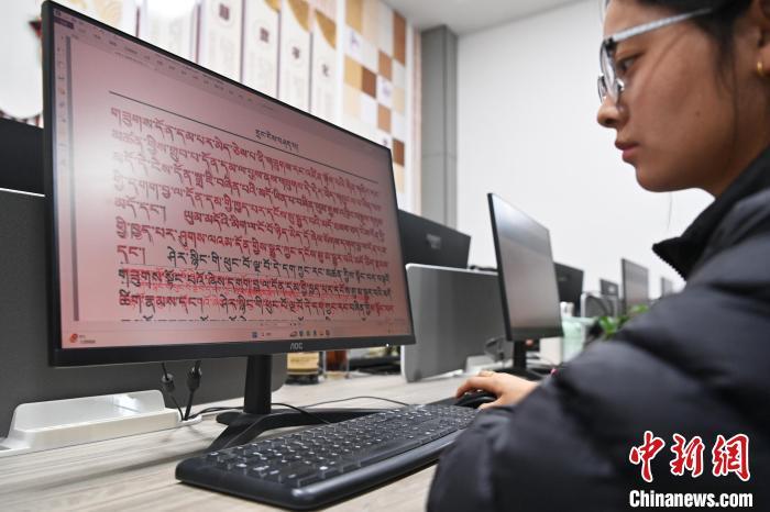 2月27日,在甘肅甘南藏族自治州碌曲縣益西達(dá)吉科技有限公司內(nèi),工作人員正在進(jìn)行藏文古籍?dāng)?shù)字化相關(guān)工作。該公司主要從事民族古籍?dāng)?shù)字化建設(shè)和古籍文獻(xiàn)數(shù)據(jù)庫(kù)建設(shè),自2019年以來(lái),承擔(dān)西藏、四川、甘肅等省區(qū)的藏文古籍?dāng)?shù)字化項(xiàng)目。圖為工作人員用該公司研發(fā)的藏文信息處理系統(tǒng)對(duì)古籍?dāng)?shù)字化內(nèi)容進(jìn)行檢查。中新社記者 九美旦增 攝