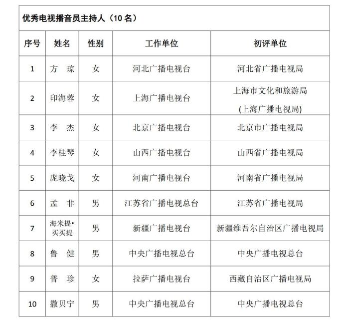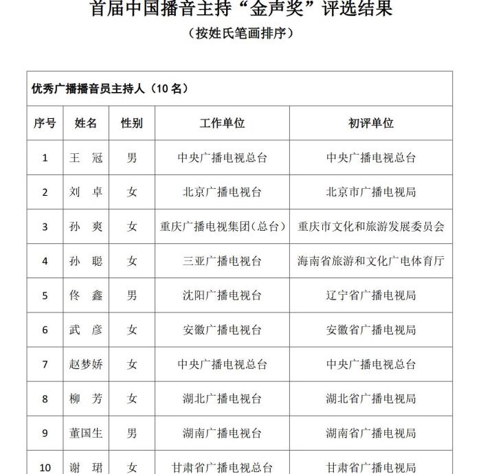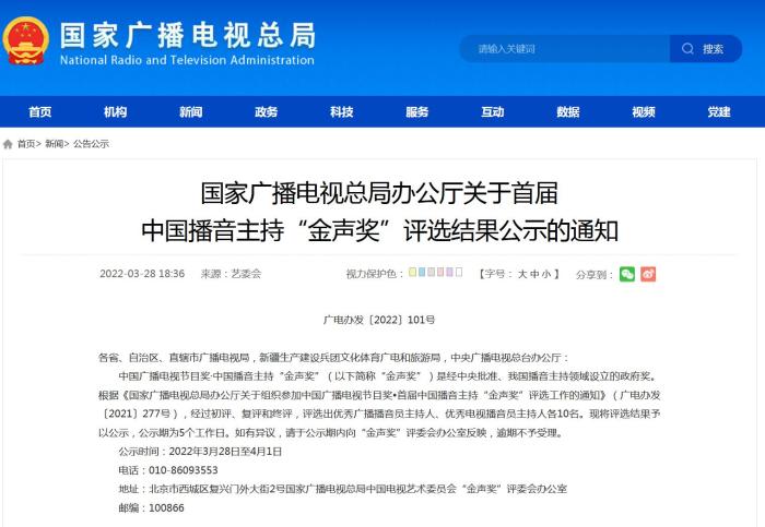 《通知》指出,根據(jù)《國家廣播電視總局辦公廳關(guān)于組織參加中國廣播電視節(jié)目獎•首屆中國播音主持“金聲獎”評選工作的通知》(廣電辦發(fā)〔2021〕277號),經(jīng)過初評、復(fù)評和終評,評選出優(yōu)秀廣播播音員主持人、優(yōu)秀電視播音員主持人各10名?,F(xiàn)將評選結(jié)果予以公示,公示期為5個工作日。