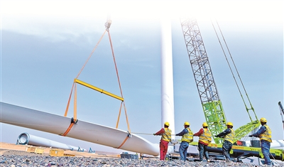 甘肅省高臺縣境內(nèi)有戈壁荒漠2000多平方公里,近年來憑借風(fēng)光資源優(yōu)勢,發(fā)力新能源產(chǎn)業(yè)賽道。圖為該縣某新能源風(fēng)力發(fā)電項目建設(shè)現(xiàn)場,工作人員正在安裝風(fēng)力發(fā)電機。新華社發(fā)