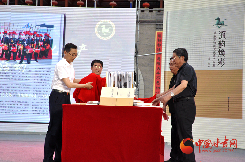 活動(dòng)中,《流韻煥彩——武威非物質(zhì)文化遺產(chǎn)圖典》揭幕并首發(fā)?!读黜崯ú?mdash;—武威非物質(zhì)文化遺產(chǎn)圖典》是由武威市文體廣電和旅游局組織編寫,讀者出版集團(tuán)旗下的甘肅科學(xué)技術(shù)出版社出版,先后歷時(shí)5載。該圖典將散落在武威廣袤大地上的璀璨珍珠串連起來(lái),將牽動(dòng)著記憶深處的濃濃情思匯聚起來(lái),展示了一個(gè)歷史武威、一個(gè)文化武威、一個(gè)多彩武威,是解讀武威的最好途徑。該圖典共收錄了84個(gè)非遺項(xiàng)目,81位項(xiàng)目代表性傳承人,用2000多張圖片和文字介紹,全方位、多角度展示了武威市非遺項(xiàng)目的獨(dú)特性、活態(tài)性、傳承性、流變性、綜合性、民族性、地域性等基本特點(diǎn)。該圖典最大的亮點(diǎn),就是在國(guó)家級(jí)、省級(jí)項(xiàng)目中融入互聯(lián)網(wǎng)思維,加入二維碼視頻鏈接,對(duì)項(xiàng)目進(jìn)行動(dòng)態(tài)視頻展示,讓《圖典》不僅可看、可讀,而且能說(shuō)會(huì)動(dòng),能唱會(huì)跳,實(shí)現(xiàn)了非遺項(xiàng)目活態(tài)傳承的創(chuàng)新。
