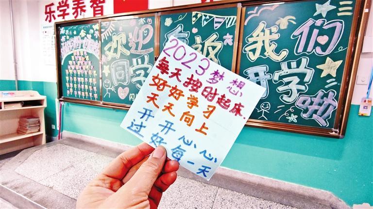 龔家灣第三小學(xué),孩子們展示裝有新學(xué)期目標(biāo)的福袋。