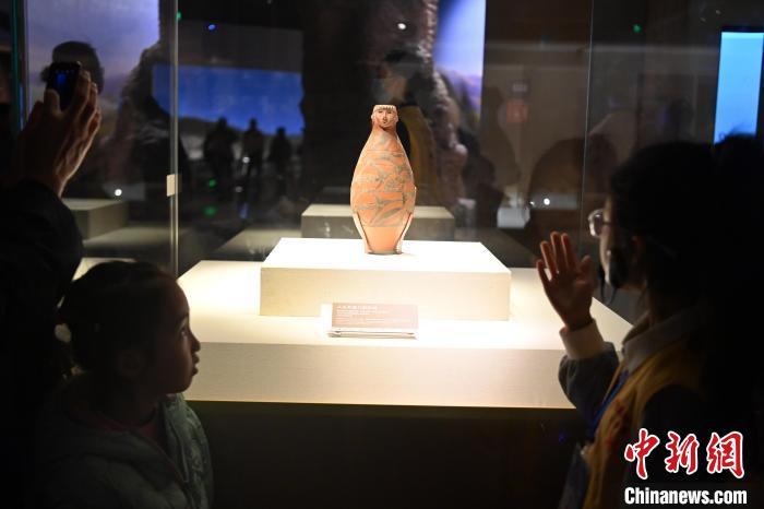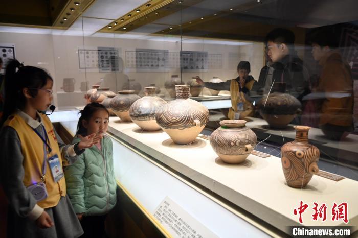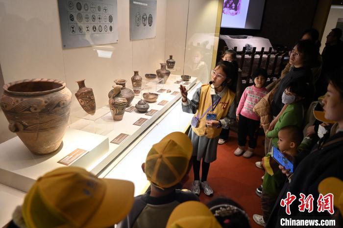 11月16日,正值周末,9歲的少年講解員侯澤依(右)在甘肅省博物館彩陶展廳為游客講解。中新社記者 九美旦增 攝