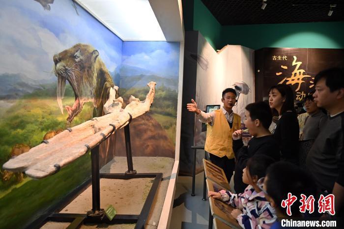 11月16日,正值周末,14歲的少年講解員侯澤磊在甘肅省博物館古生物化石展廳為游客講解。中新社記者 九美旦增 攝