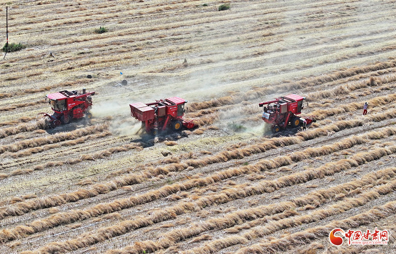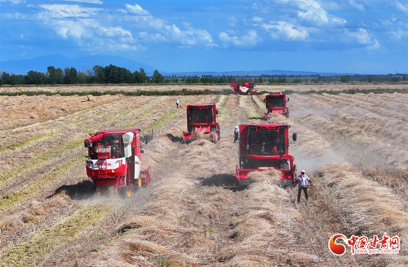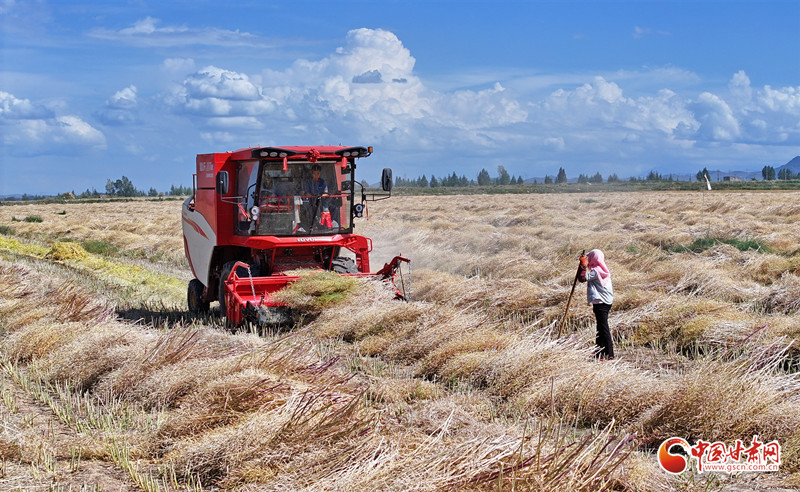 8月24日,在民樂(lè)縣新天鎮(zhèn)韓營(yíng)村千畝油菜種植基地,村民駕駛農(nóng)機(jī)在田間開(kāi)展油菜籽搶收作業(yè)。
