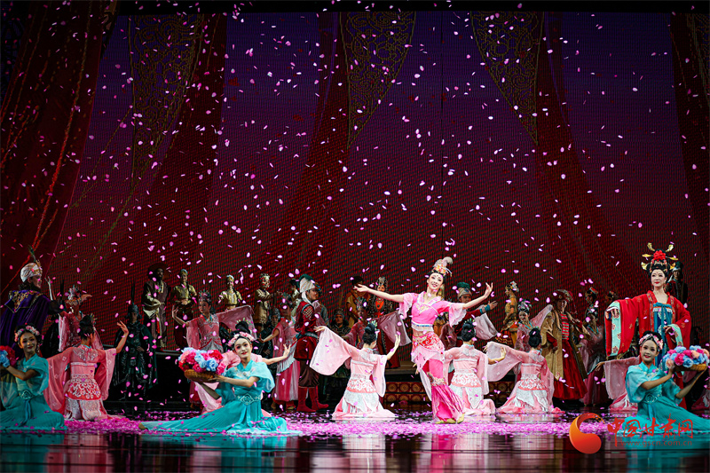 當(dāng)全息投影將莫高窟壁畫在舞臺(tái)上緩緩展開,當(dāng)駝鈴聲與電子樂編曲交織出跨越時(shí)空的和弦,觀眾相信,所謂“傳統(tǒng)”從不是凝固的標(biāo)本,而是流動(dòng)的生命,正如劇中穿越千年的花雨,落在古代畫工的筆端,落在當(dāng)代舞者的袖間,浸潤海內(nèi)外每一位觀演者的心田。劇中描繪的中外友好通商、民心交融場景,更是對新時(shí)代“一帶一路”倡議的生動(dòng)詮釋。(甘肅省文化旅游廳供圖)