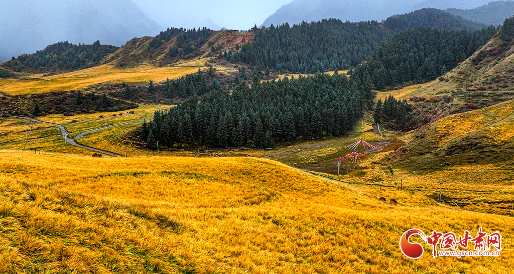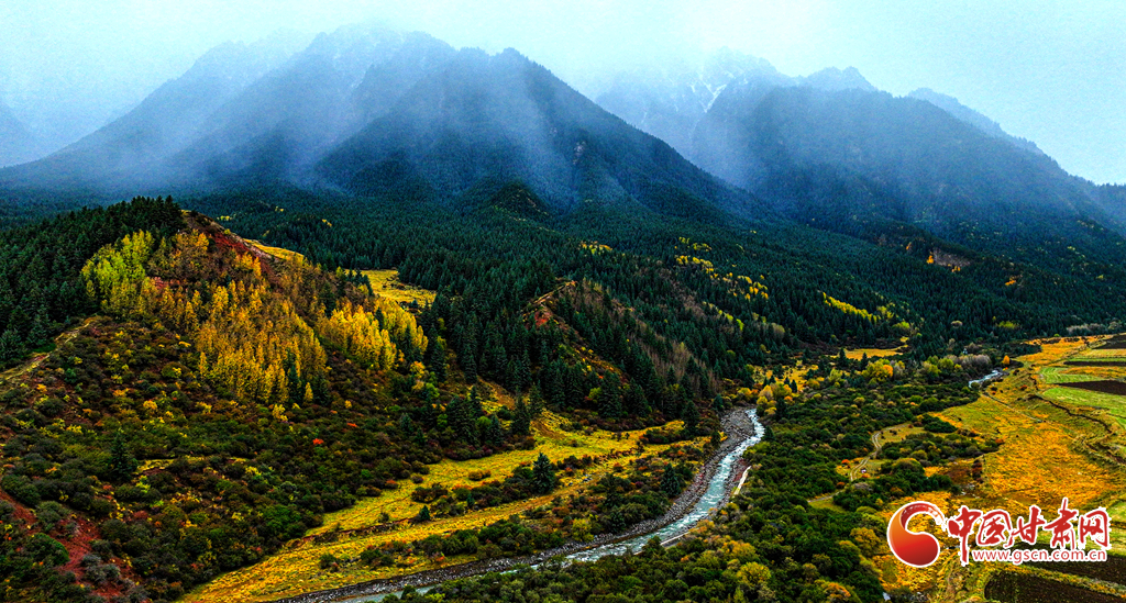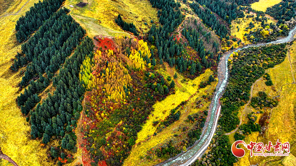 金秋十月,祁連山國家公園迎來最絢爛的季節(jié)。雪峰映照著斑斕林海,山霧繚繞其間,原始森林、雪山、草甸、霜葉構成垂直景觀帶。雪白、金黃、深紅與湛藍交相輝映,黃綠為底,紅金點染,宛如一幅渾然天成的油畫。
