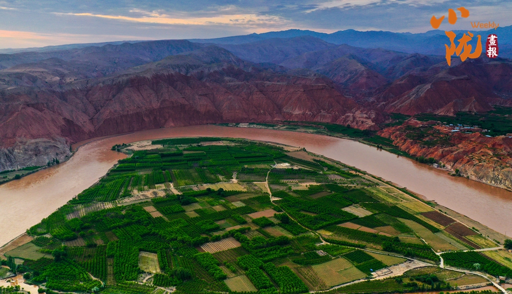 沿著黃河岸邊望去,大片綠色田園如翡翠般鑲嵌在廣袤曠野之中。阡陌縱橫間,莊稼隨風(fēng)搖曳,為蒼涼的河谷增添了一抹靈動的柔情。遠處的村落、搖曳的蘆葦、穿梭的飛鳥,與紅山碧水共同繪就了一幅層次豐富的山水畫卷?!?/p>