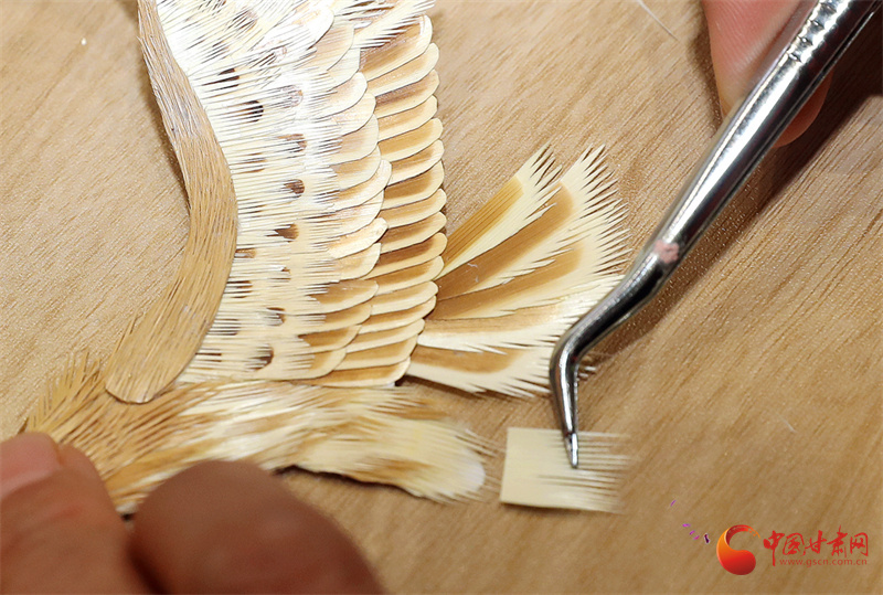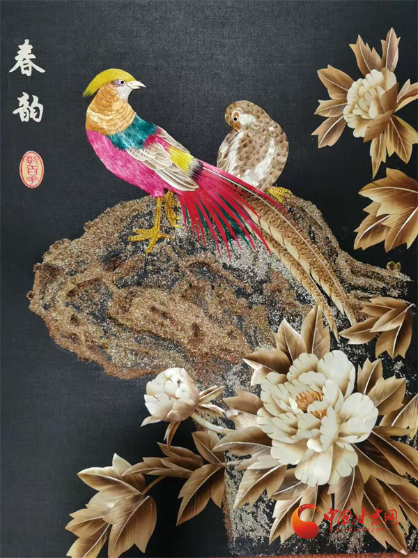 多年打磨后,郭百花走出了獨(dú)特的創(chuàng)作之路——以拼貼手法為主,讓作品更具層次感與立體感。在她十幾平米的“百花麥稈藝術(shù)工作室”里,《春韻》勾勒出江南詩(shī)意,《敦煌文旅》再現(xiàn)絲路風(fēng)情,《孔雀戲牡丹》盡顯雍容華貴,而《錦上添花》中,小鳥的羽毛竟由細(xì)如發(fā)絲的麥稈剪貼而成,市場(chǎng)價(jià)達(dá)1500元左右。這些作品里,既有山川花鳥的靈動(dòng),更藏著通渭的鄉(xiāng)土記憶,平凡麥稈在她手中徹底“化腐朽為神奇”。