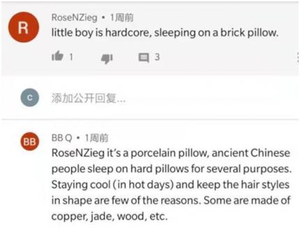 RoseNZieg留言:“這是個(gè)硬核男孩兒,睡在石頭枕頭上。”BBQ回復(fù)樓主:“這個(gè)枕頭是瓷器,中國(guó)古人都睡在這種硬枕頭上,還有一些是銅、玉、木頭做的。睡這種枕頭,不冬暖,但夏涼,還能保持飄逸的發(fā)型”