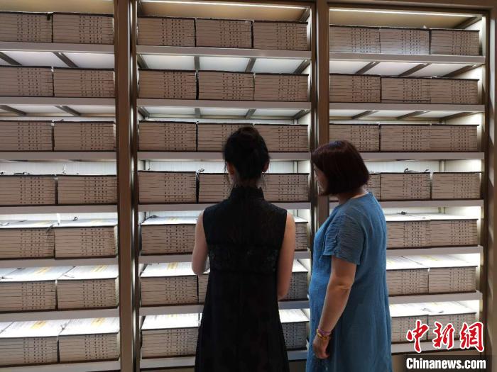 中新網(wǎng)杭州6月18日電(童笑雨) 古色古香的木質(zhì)外包,干凈整潔的手工印刷,6月18日,線裝全套文淵閣《四庫全書》在浙江杭州展出。據(jù)相關(guān)負責人介紹,該套叢書將對民眾免費開放,各界人士均可來“西湖會客廳”閱讀、研究。