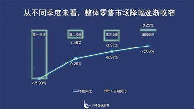 從時間軸來看,整體零售市場第一季度受疫情影響最為嚴重,同比下降15.93%,二季度復(fù)工復(fù)產(chǎn)復(fù)學(xué)急速收窄降幅,三季度同比下降3.3%,降幅略增,到第四季度回暖,同比出現(xiàn)小幅上漲,上升了0.25%。