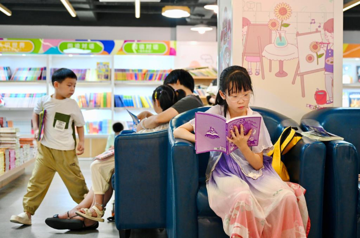 7月6日,福州新華書(shū)店鰲峰坊書(shū)城內(nèi)家長(zhǎng)陪伴孩子讀書(shū)納涼。