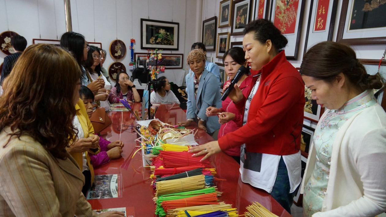 (唐彩萍在扶貧車間為留守婦女講解麥稈畫的制作方法)